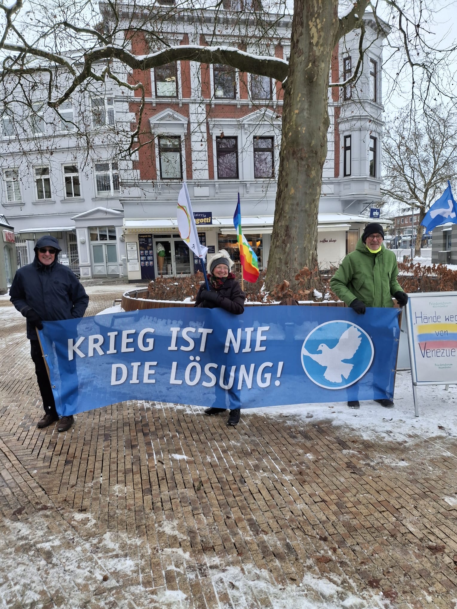 Am Freitag, den 9. Januar, 11.00 Uhr veranstaltet das Friedensforum Neumünster einen Friedensdialog (früher Mahnwache genannt) auf dem Großflecken vor der Buchhandlung Krauskopf (also an gewohnter Stelle). Das Thema sind die Ereignisse um Venezuela und darüber hinaus.