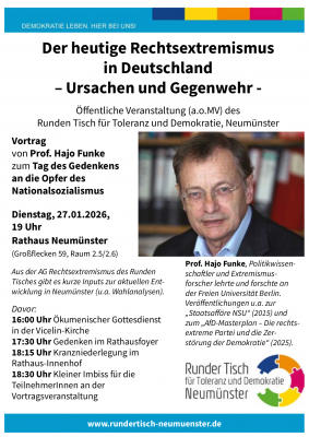 Der Runde Tisch für Toleranz und Demokratie, Neumünster, veranstaltet (a.o.MV) einen öffentlichen Vortrag von Prof. Hajo Funke zum Tag des Gedenkens an die Opfer des Nationalsozialismus am Dienstag, 27.01.2026, 19 Uhr im Rathaus Neumünster (Großflecken 59, Raum 2.5/2.6). Thema : Der heutige Rechtsextremismus in Deutschland – Ursachen und Gegenwehr -.